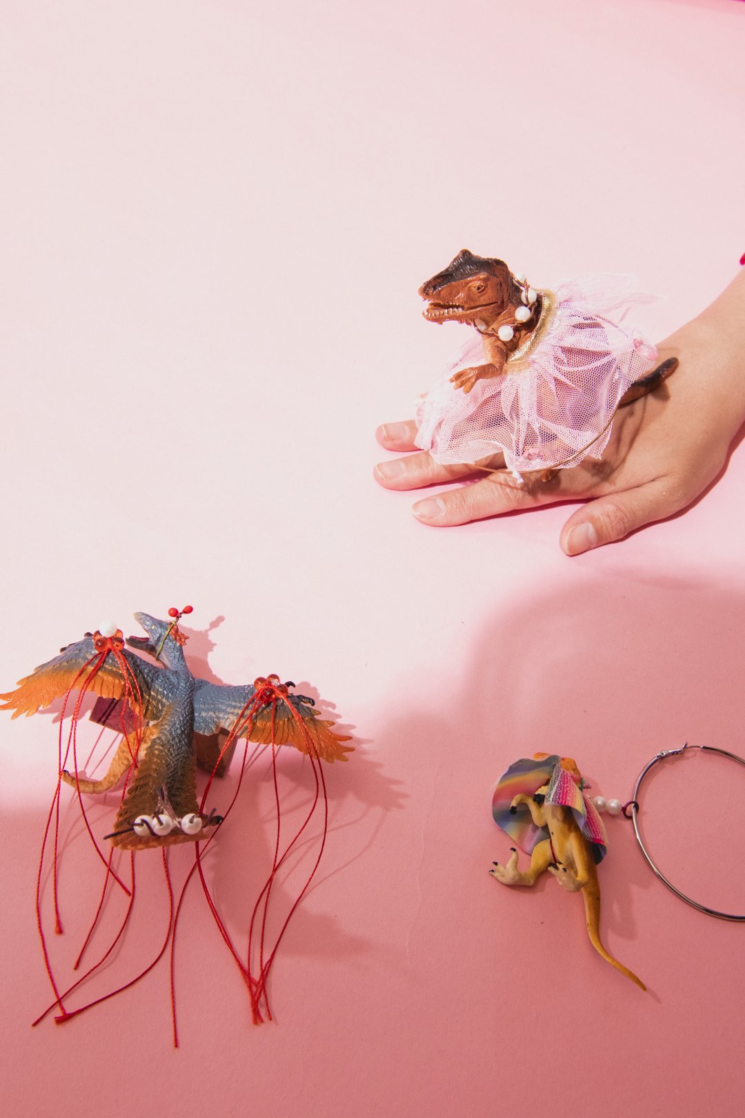 My second work Dinosaur in a Skirt shows that children's gender cognition basically comes from the guidance of parents and relatives as well as the influence of things around them. Different cognitive processes may lead to different gender differences in children. Dinosaur is my favourite toy as a child, but in the eyes of an adult as a girl, I should play with the girls play toys, For example, dolls. The series of jewellery by toy dinosaurs wear women's clothing and wear jewellery have elements of pearl to discuss social on children's gender stereotypes that theme and cause the viewer on gender equality.