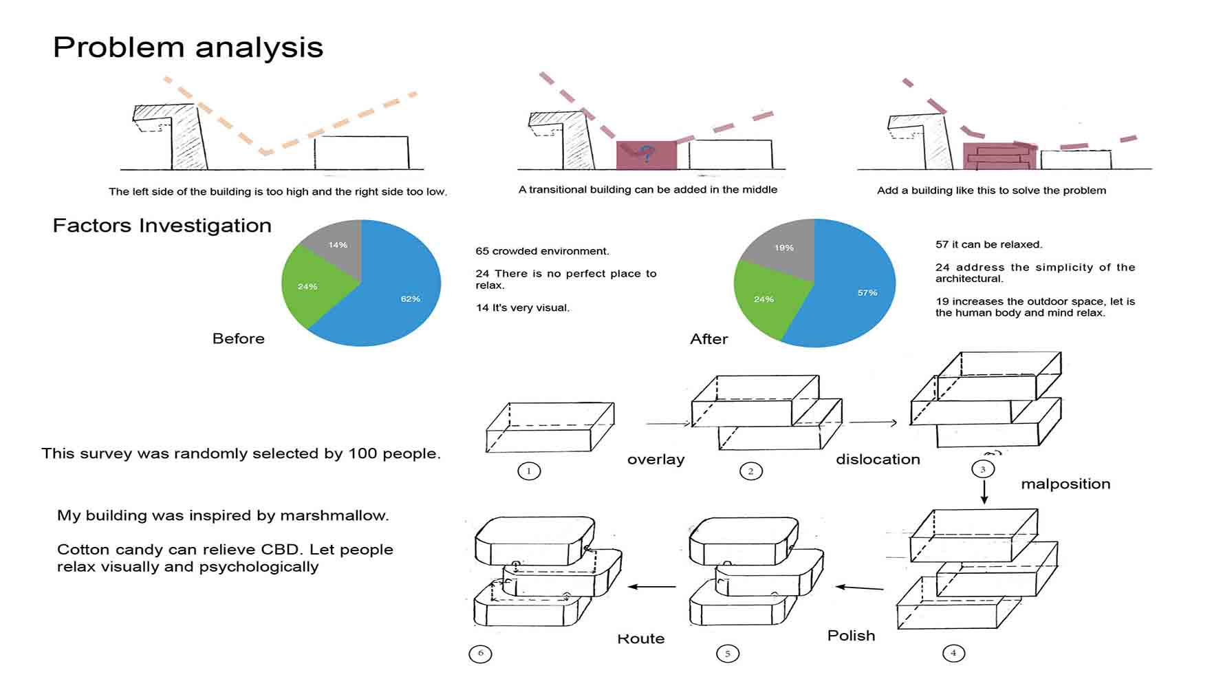 In the process of learning architectural design, I realize that the needs and definitions of architecture are different among different people, and the same architecture also needs to take into account the needs of the times to change. Breathing Space》. of Works By investigating the attitude and work and life needs of CBD people, I finally combined the global epidemic factors. I hope that the form of architecture can be more diversified than a single situation. Through some personal experiences in recent years, some people do not want to make creative changes, but to make a single copy in the general environment. Simple steel frame, glass building, at the same time cause great visual fatigue. Make art progress slow.