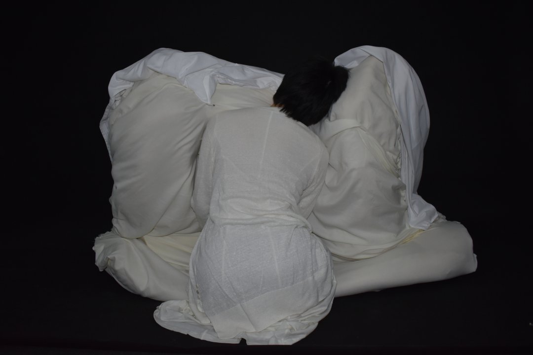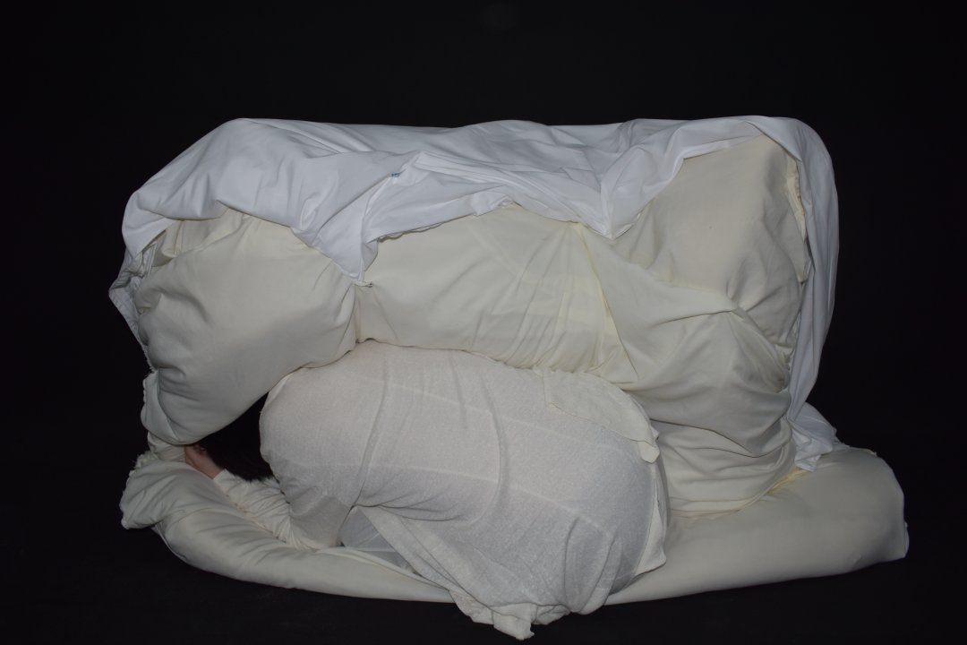 《被子之神》這件作品源自于我對被子的異常迷戀。當我對一件物的情感達到了異于常態的狀態,物變成了主宰者——神,而我則變為了物的附屬品。這件作品,闡述我將作品神化的一個過程。